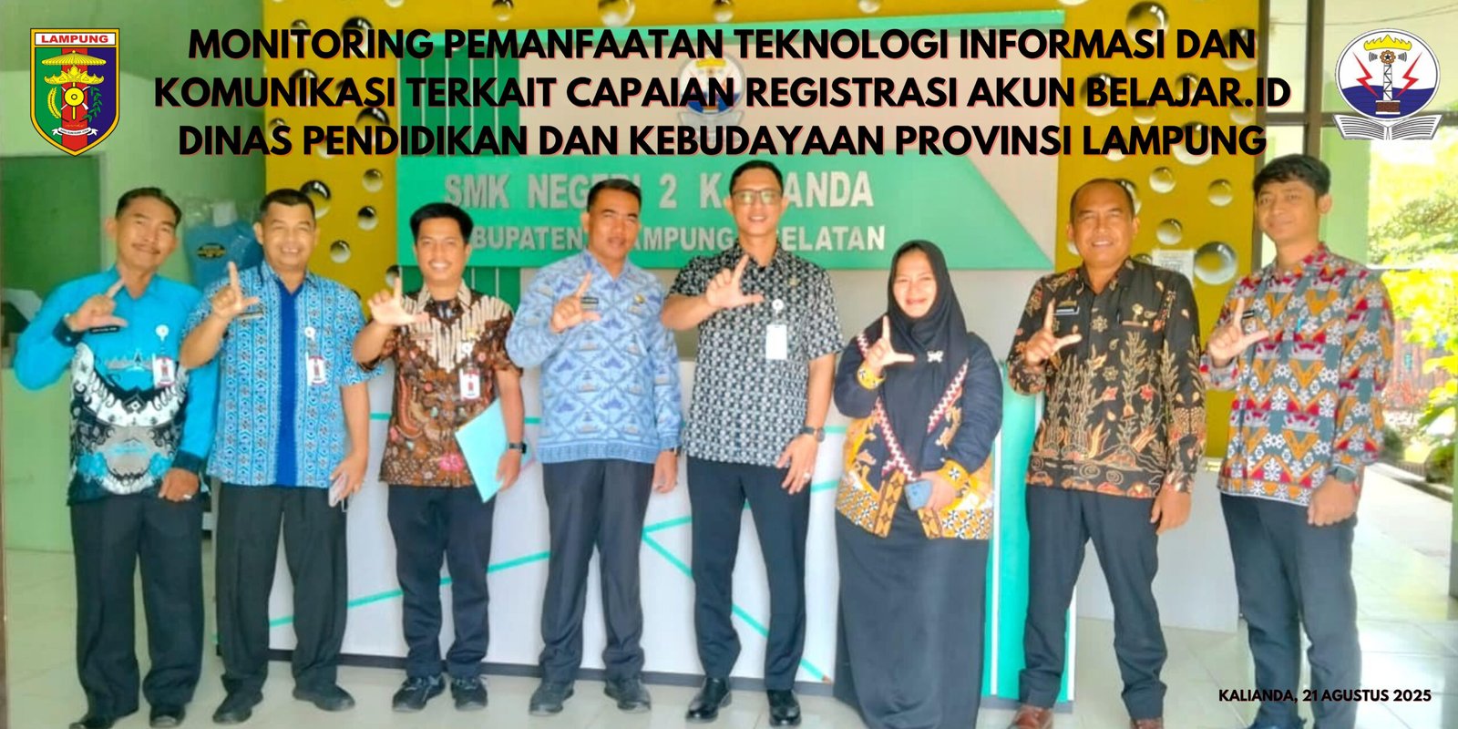Kalianda, 21 Agustus 2025 – SMK Negeri 2 Kalianda menerima kunjungan Dinas Pendidikan dan Kebudayaan Provinsi Lampung dalam rangka Monitoring Pemanfaatan Teknologi Informasi dan Komunikasi (TIK) khususnya terkait capaian registrasi dan aktivasi akun belajar.id bagi peserta didik.